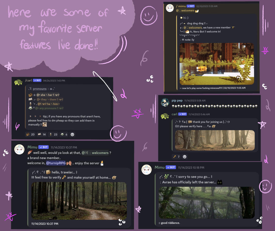 • you may dm and ask for an example of my previous servers; i can send you photos or screen recordings of ones i've made!!